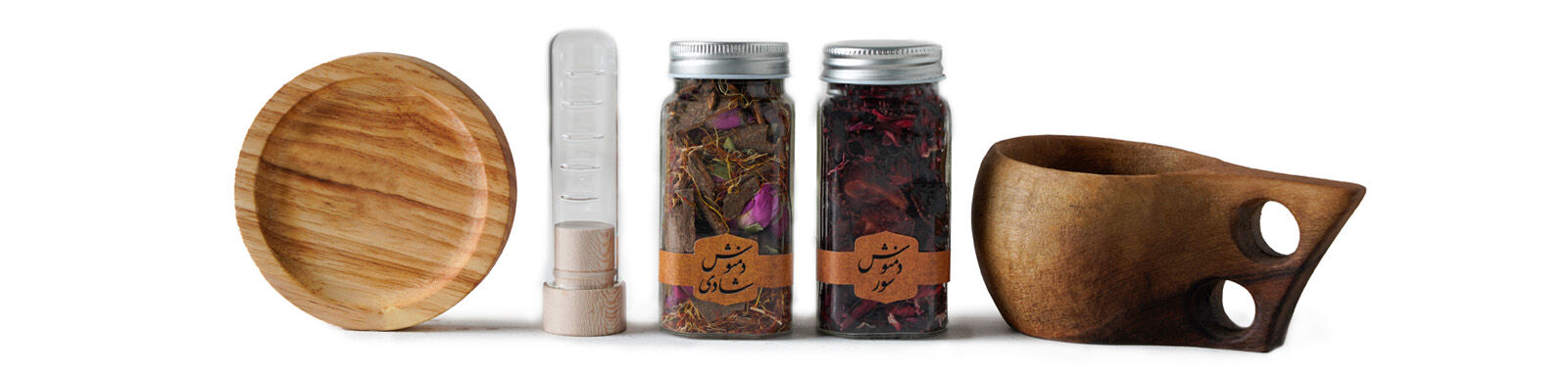 دمنوش شادی (زعفران،دارچین،گل سرخ) دمنوش سور(توت فرنگی،چای ترش، چای سیاه) عصاره گیره شیشه ای دست ساز ماگ چوبی زیر لیوانی چوبی