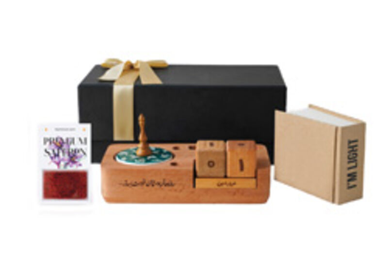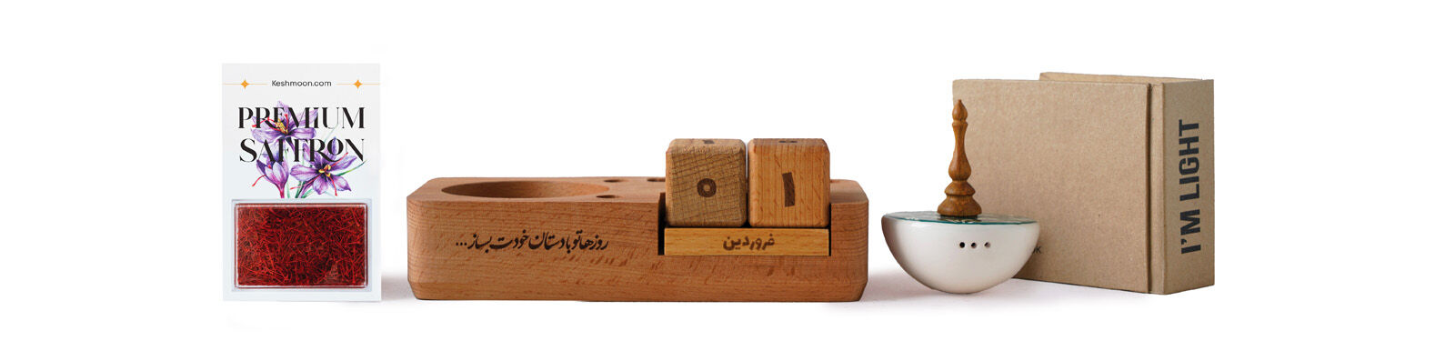 تقویم روزشمار چوبی فرفره سرامیکی دستساز (نمک پاش) دفترچه یادداشت زعفران سرگل یک مثقالی
