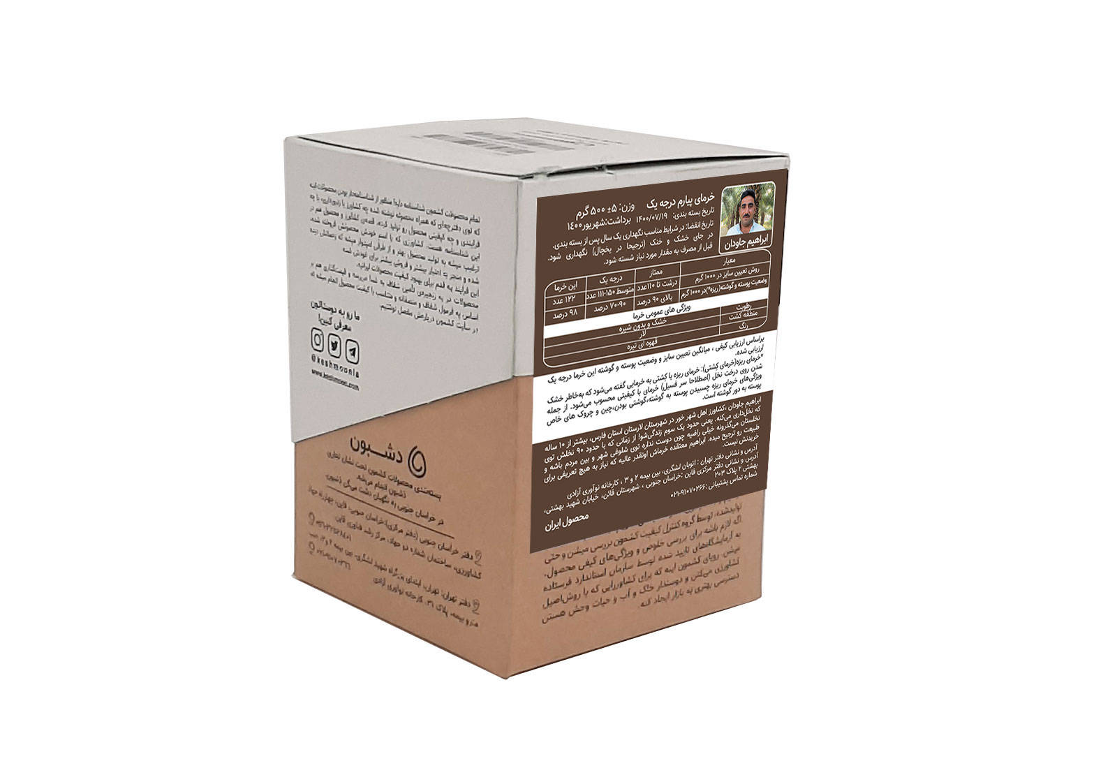 خرما پیارم رو از خود کشاورز بصورت مستقیم بخرین، تمامی محصولات دارای تاییدیه آزمایشگاه هستن و خرمایی که به دست شما میرسه، توسط تیم کنترل کیفیت کشمون بررسی شده.